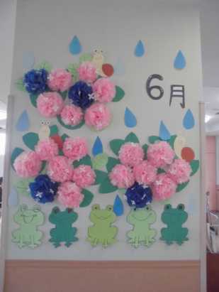 他にも紫陽花といえば雨・カエル・カタツムリと連想させてゲスト様にも協力していただき作成しました!!