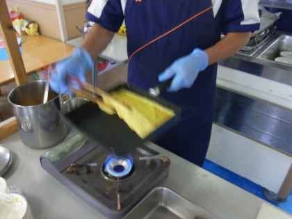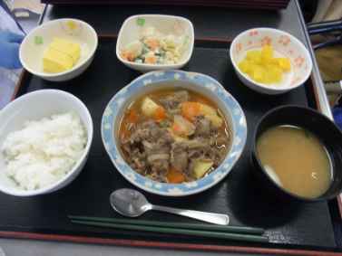 本日のメニューは肉じゃが、お味噌汁、カリフラワーのサラダ、フルーツの缶詰めでした。