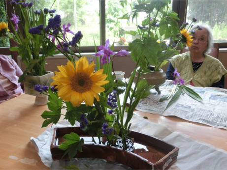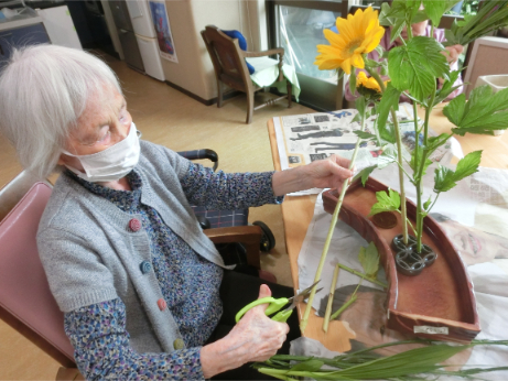 生け花🌻 風薫る5月!!母の日にはご家族様からのお花を受け取られたゲスト様も おられましたが、毎月お楽しみの生け花があり、今月も行われました♡ 皆様花器に合わせて、伸びやかに個性的に生けられます‼ 作品はご自身のお部屋に飾られたり、共有スペースに飾られたり、自由です。 お水を足したりお世話もして下さいます。 今グループホームラ・アケソニアは室内も屋外も!花盛りです!
