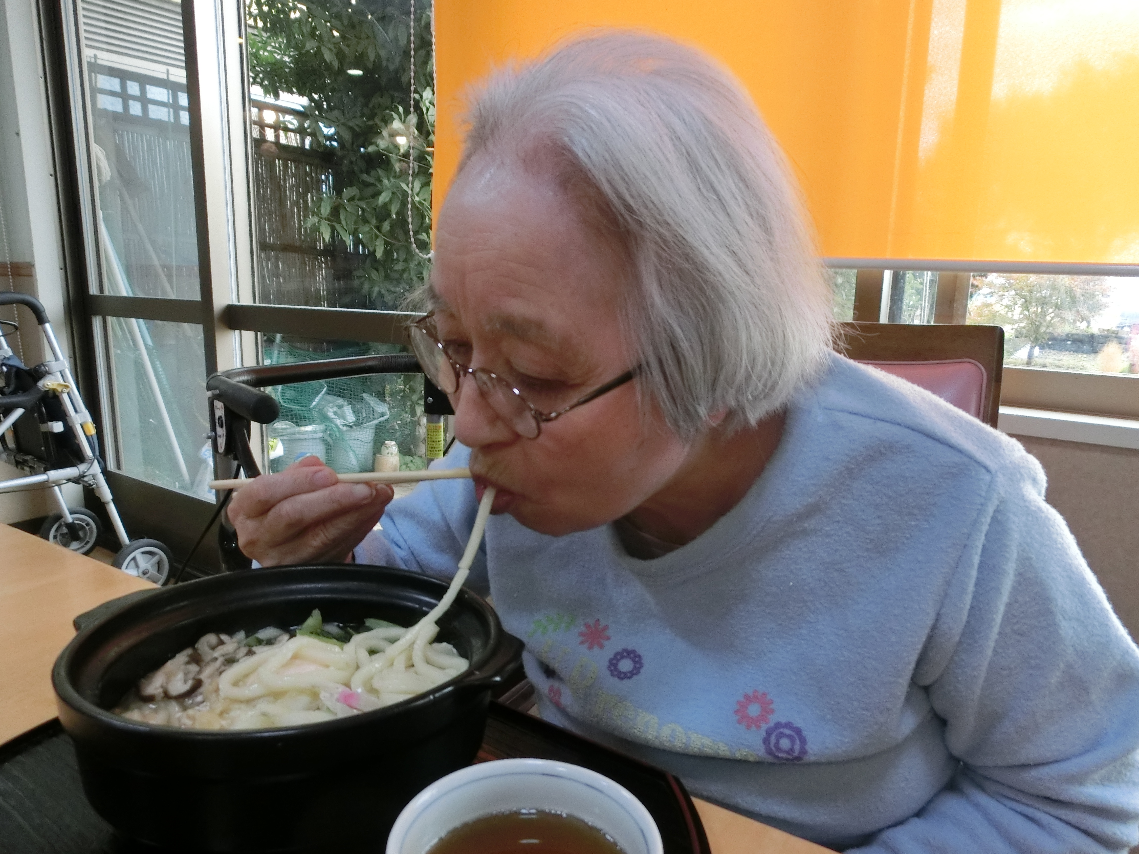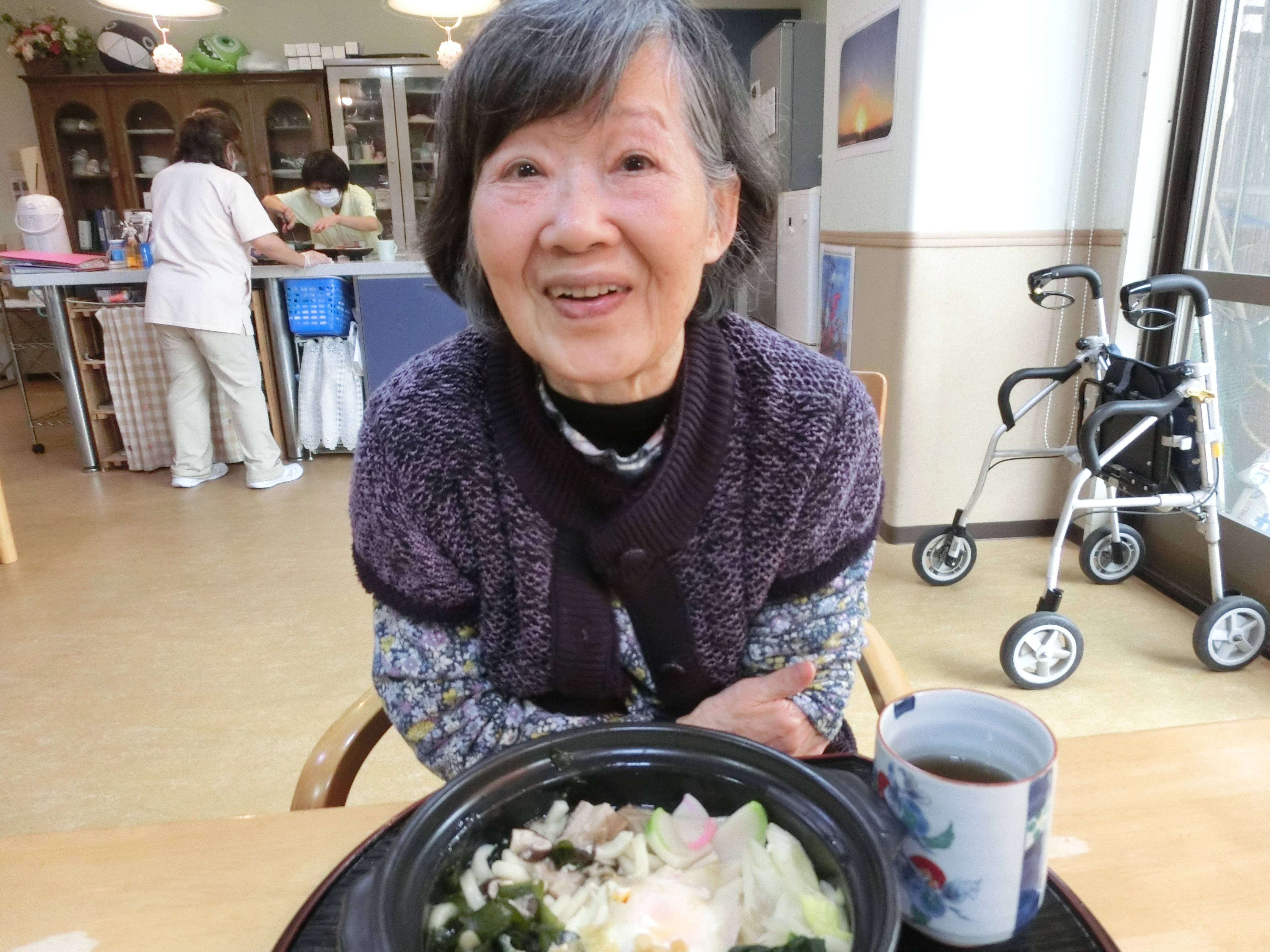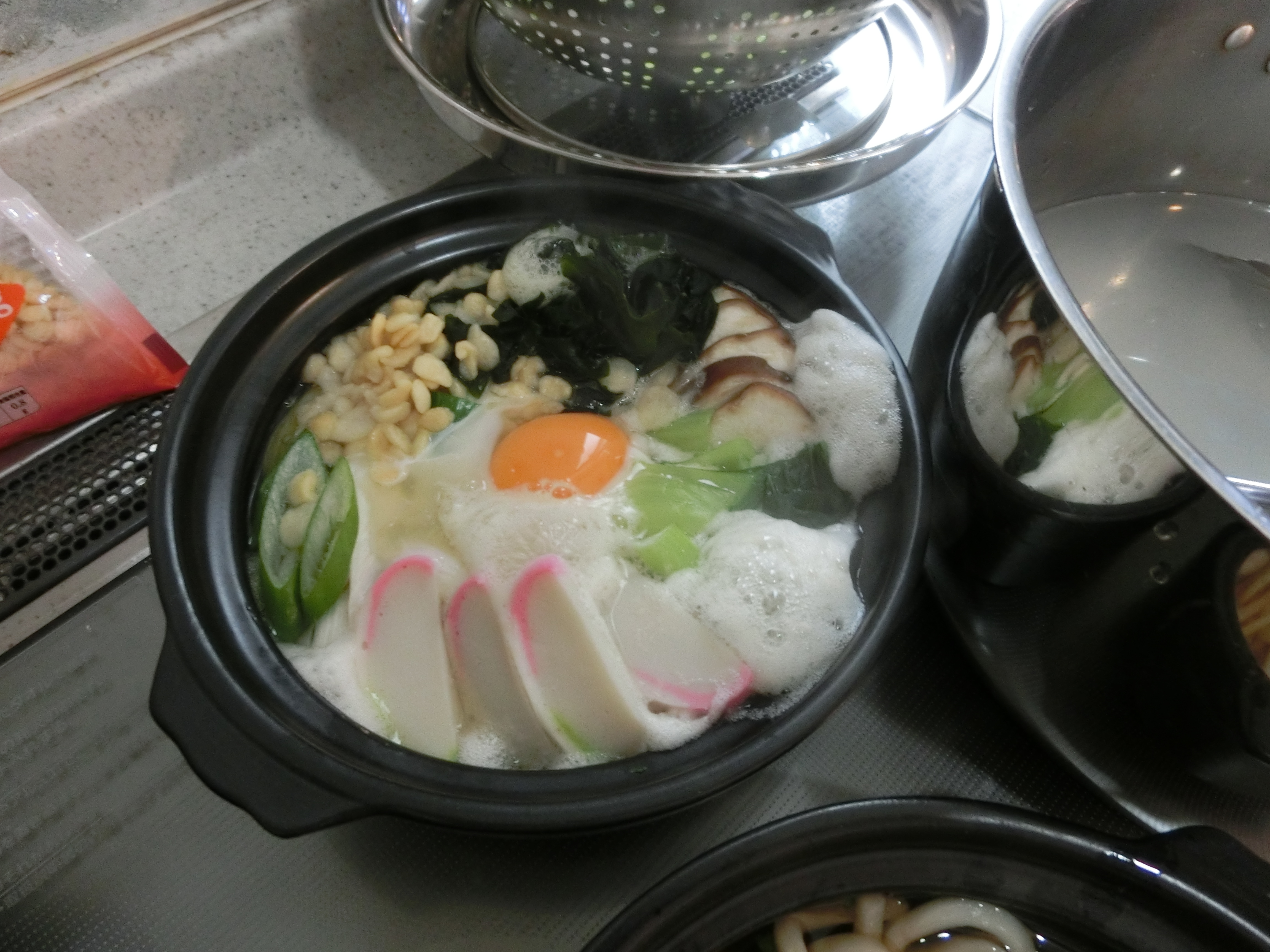 アケソニアGHに一人用の土鍋があるのでそれを使い、心も体も温まる鍋焼きうどんを作りました。