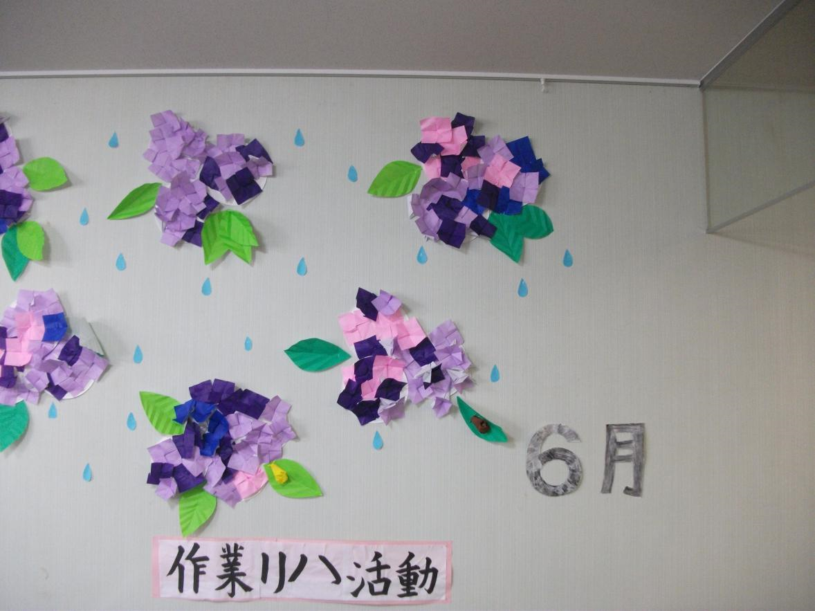作業療法では季節ごとに様々な創作活動を実施しています。6月はあじさいですが、