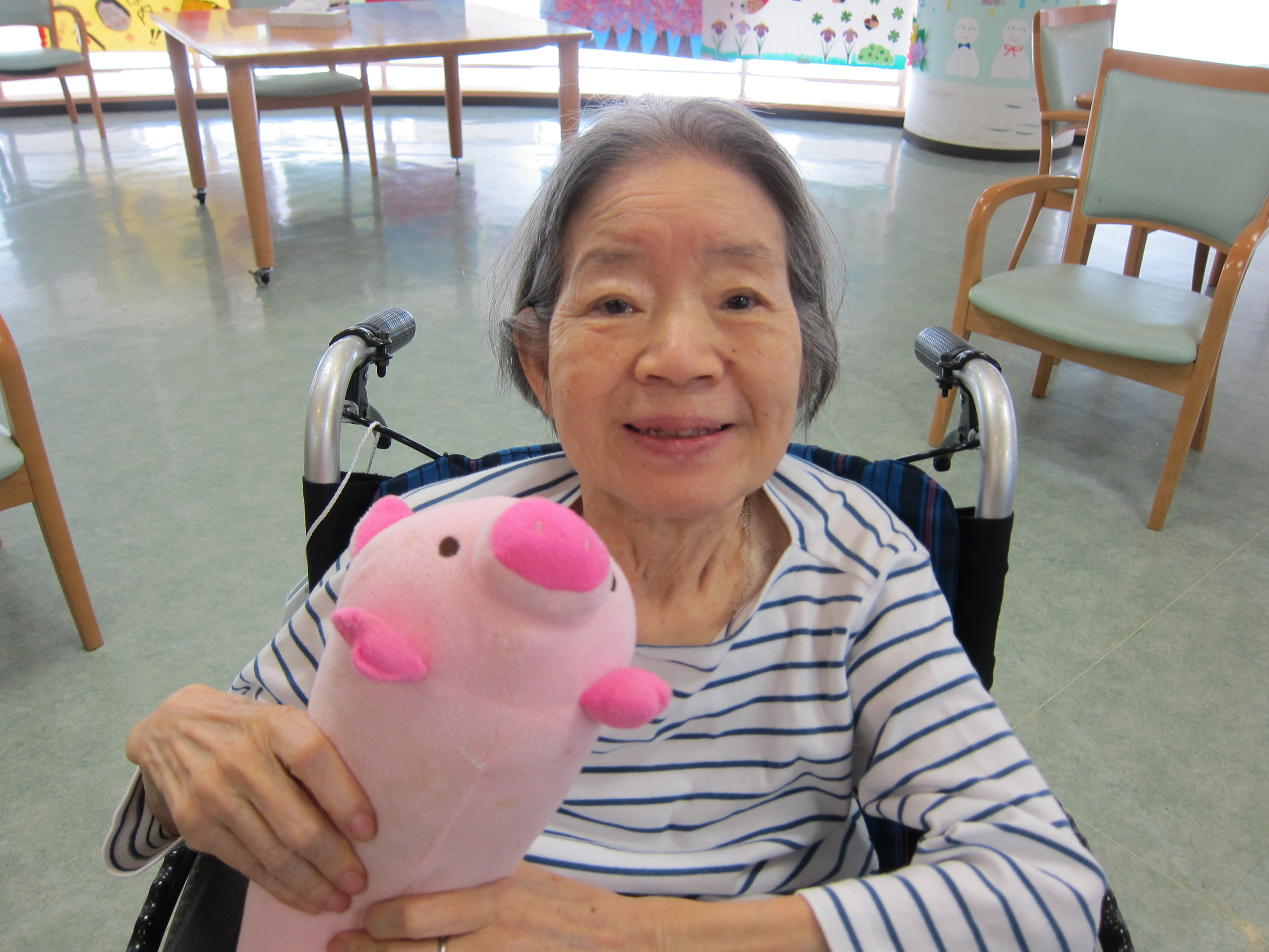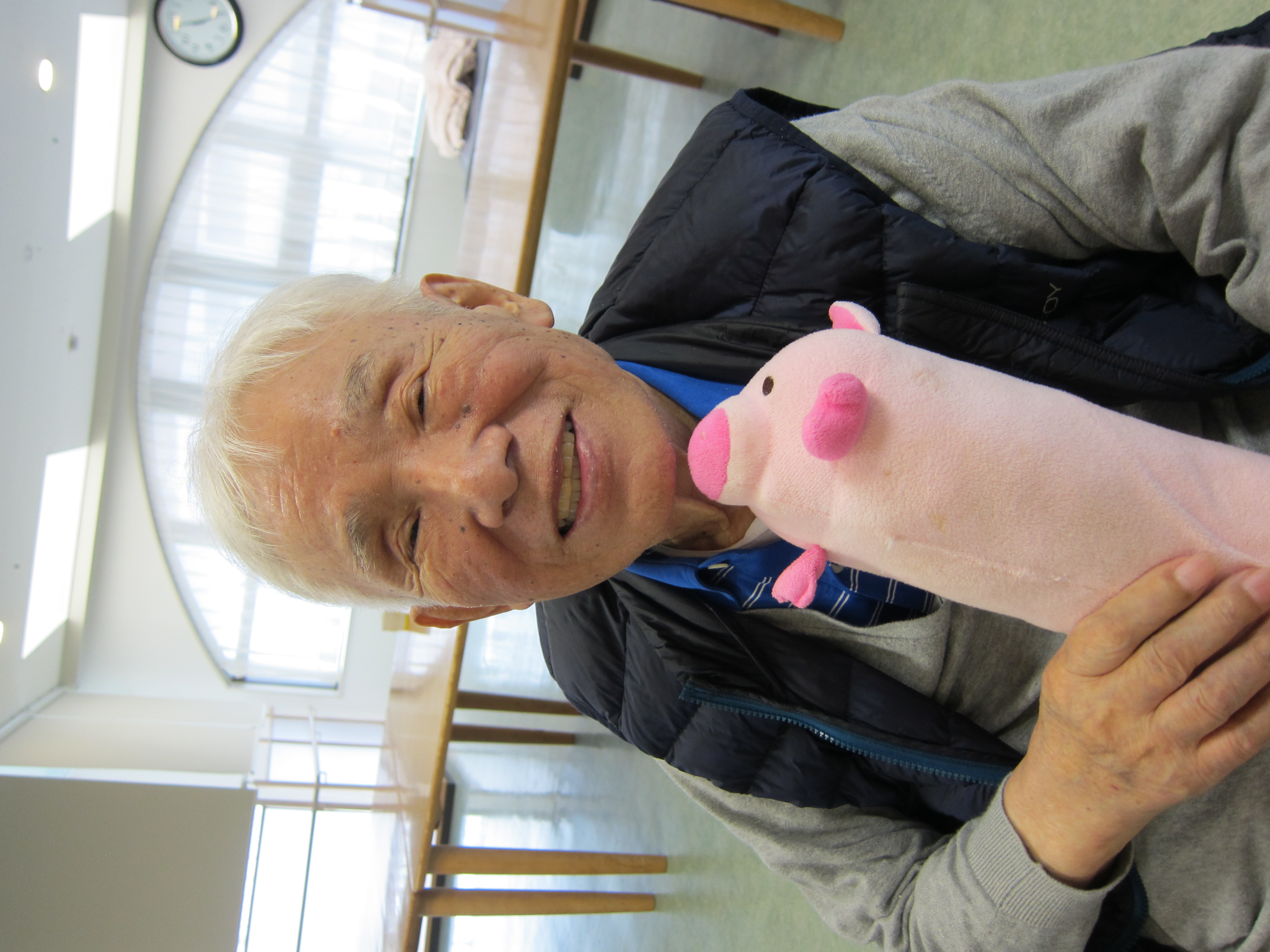 ブタ?さんのクッションを使って笑顔で写真大会しました?