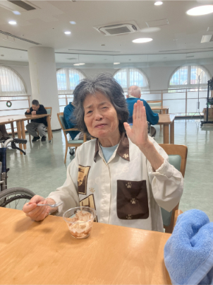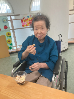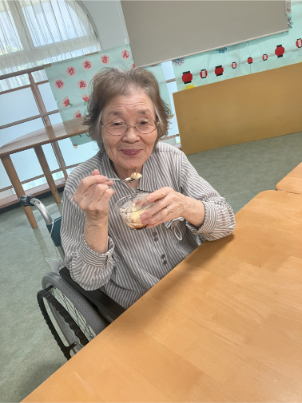 皆さん、暑い日が続きますが、水分をしっかりとって熱中症等に注意して過ごしてくださいね。 今回は、おやつでは珍しくアイスクリームが出ていたのでその様子をお届けします。 皆さん、甘くて冷たいアイスクリームを笑顔いっぱいで召し上がっていました。 まだまだ暑い日は続くのでアイスクリームが出てくると嬉しいですよね?