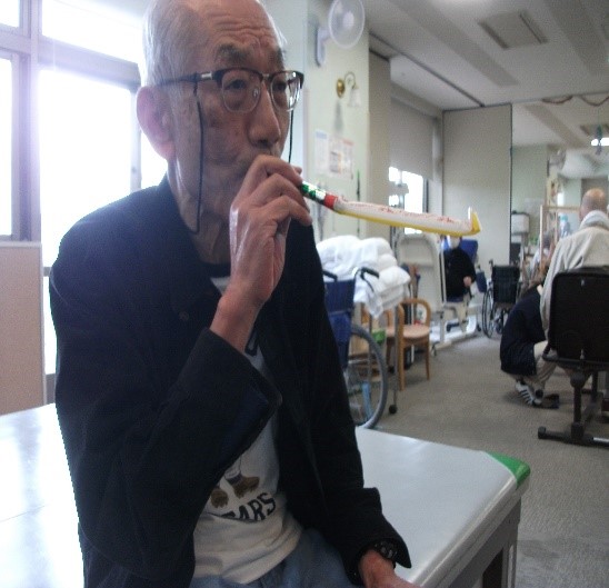 巻き笛を吹くことで、腹式呼吸や口元の筋力をつける訓練(口腔機能の改善)につながります。