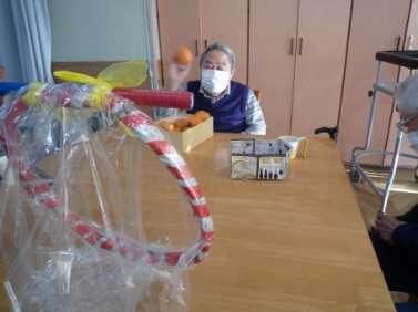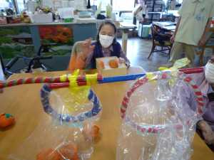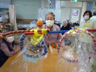 スタッフお手製の柿を点数の書かれた輪にどんどん投げ入れます。