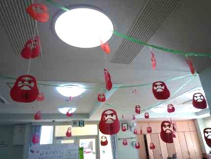 天井からの飾りは、可愛いダルマさんにし、縁起の良い漢字を1つ1つ書いてみました☺