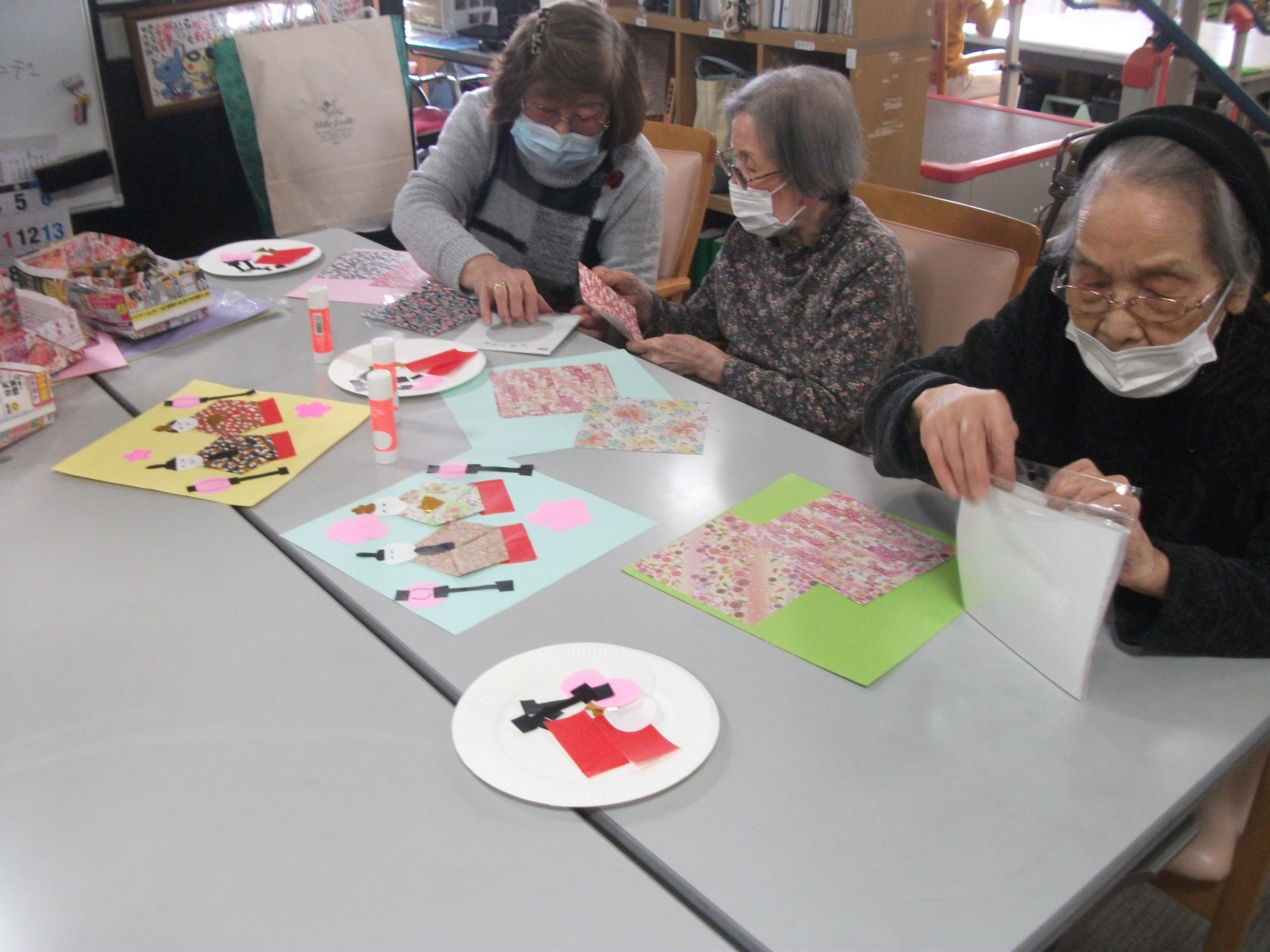 気に入った柄の折り紙を自分で選んで、お手本を見ながら折っていきます。