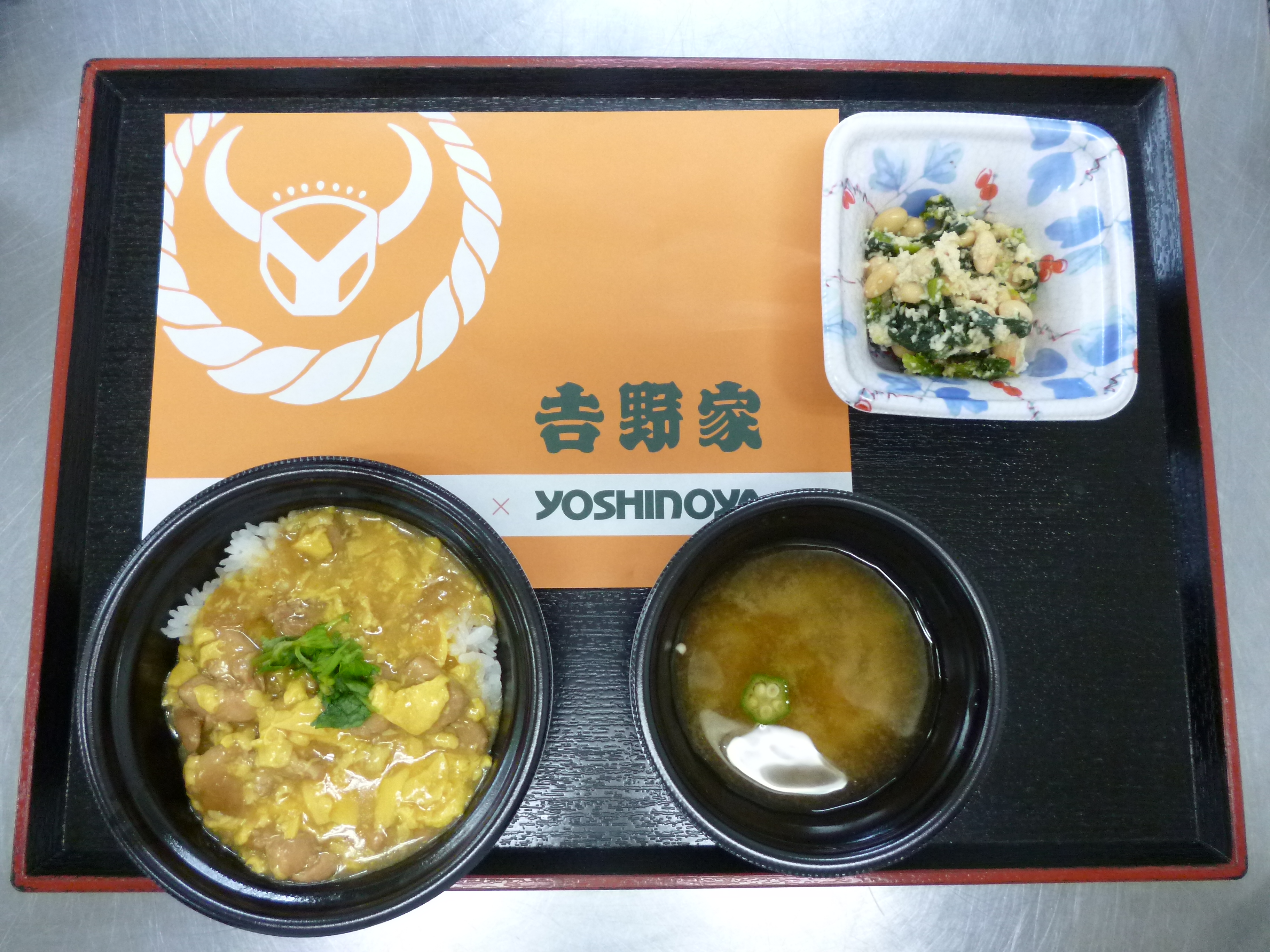 吉野家の特製親子丼と白和えにお味噌汁です?