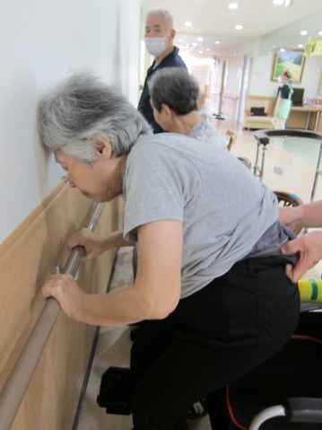 10秒間、手すりにつかまり立ち続ける動作を10回行います。