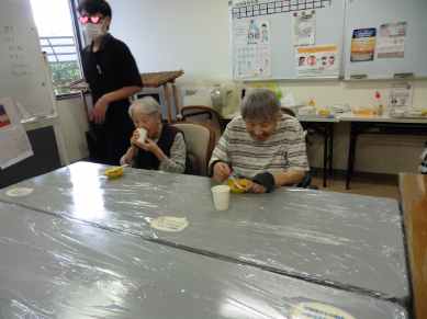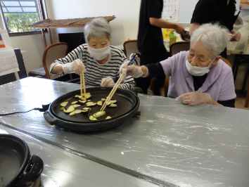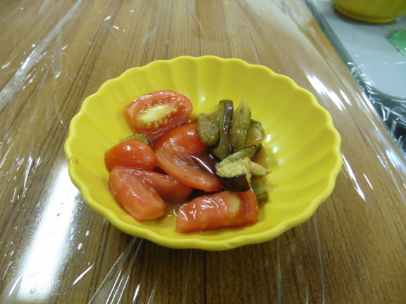 今回の作業リハでは6月に中庭で植えたナスビとトマトを収穫し調理をしました。