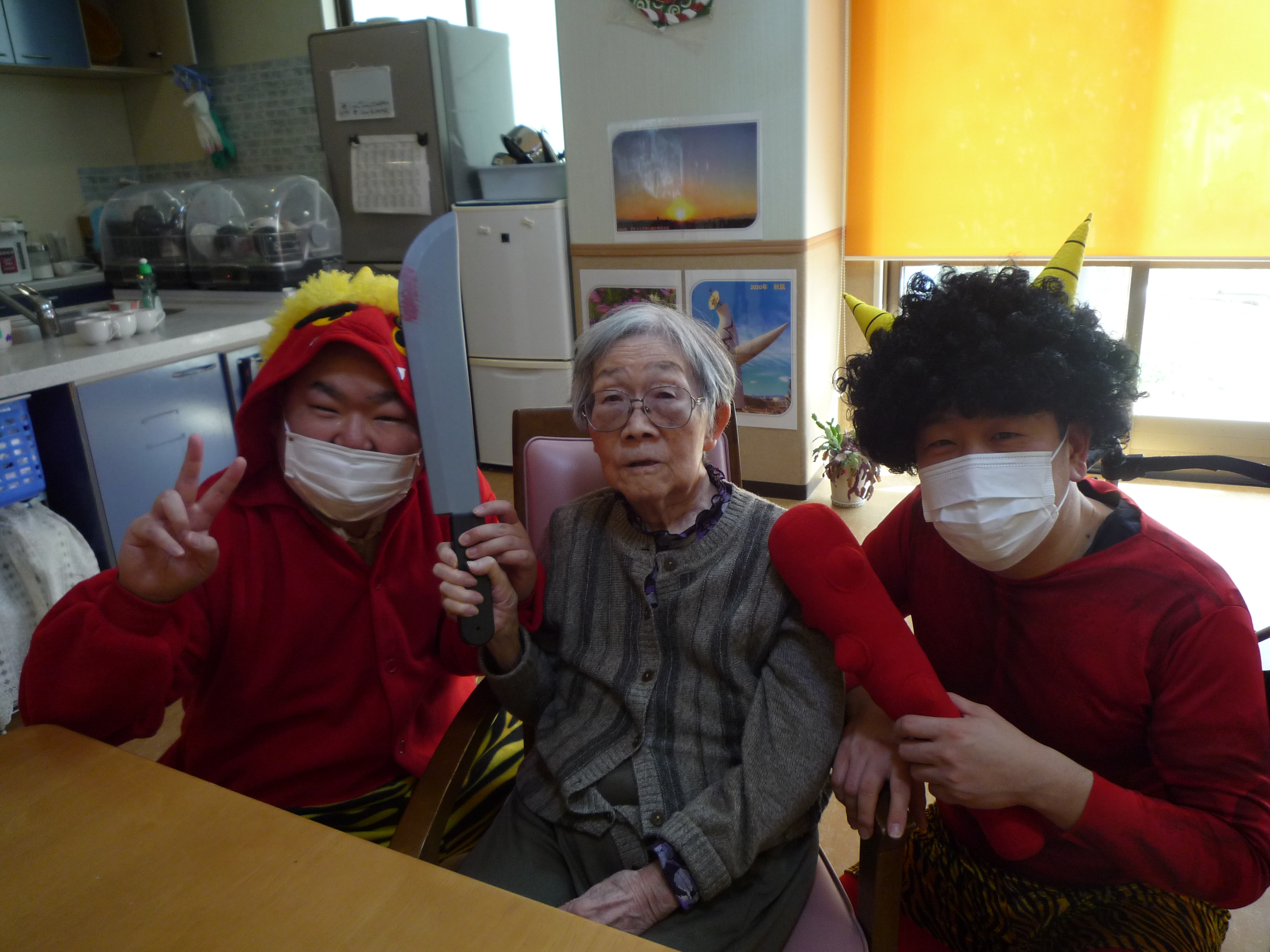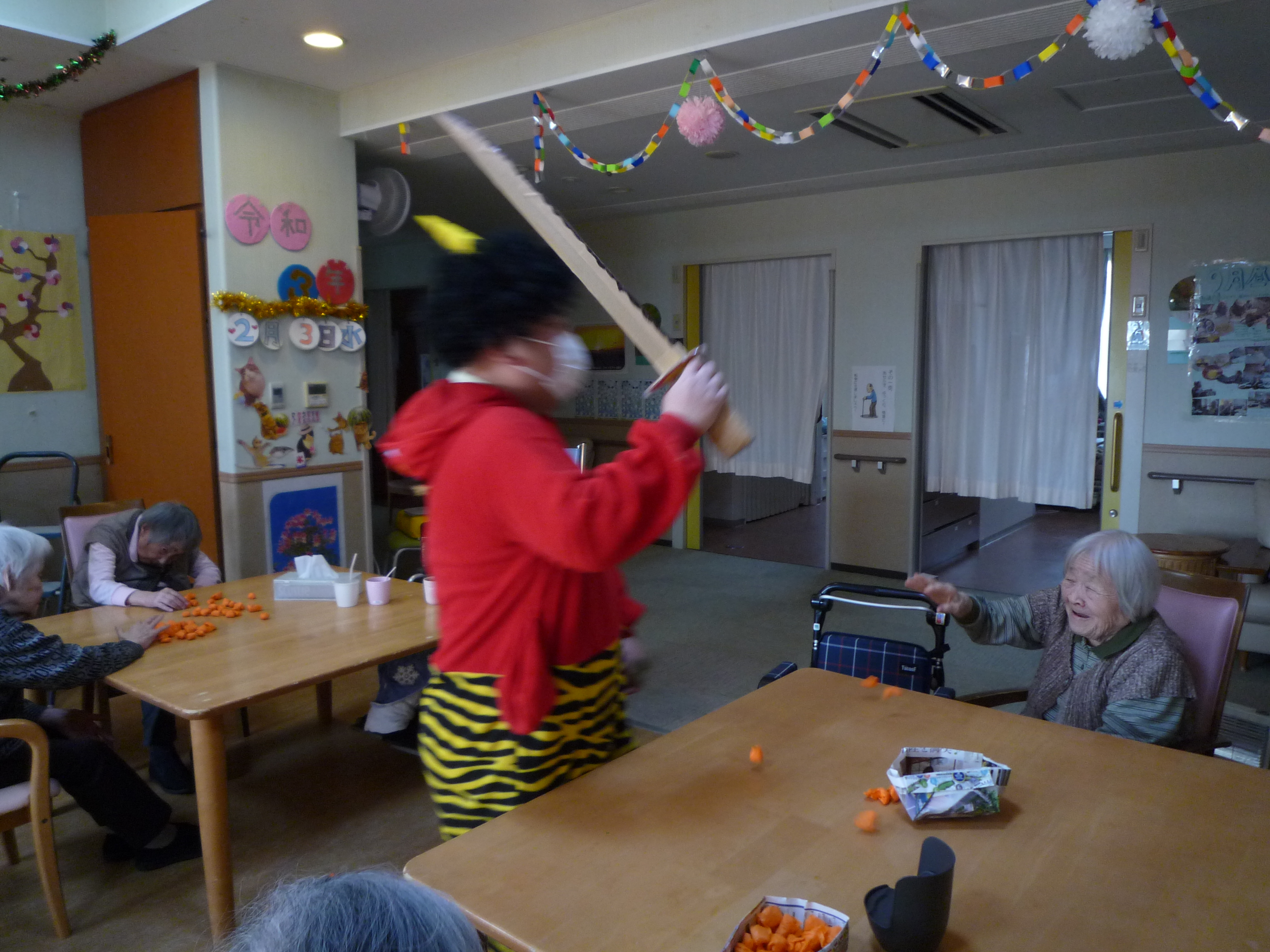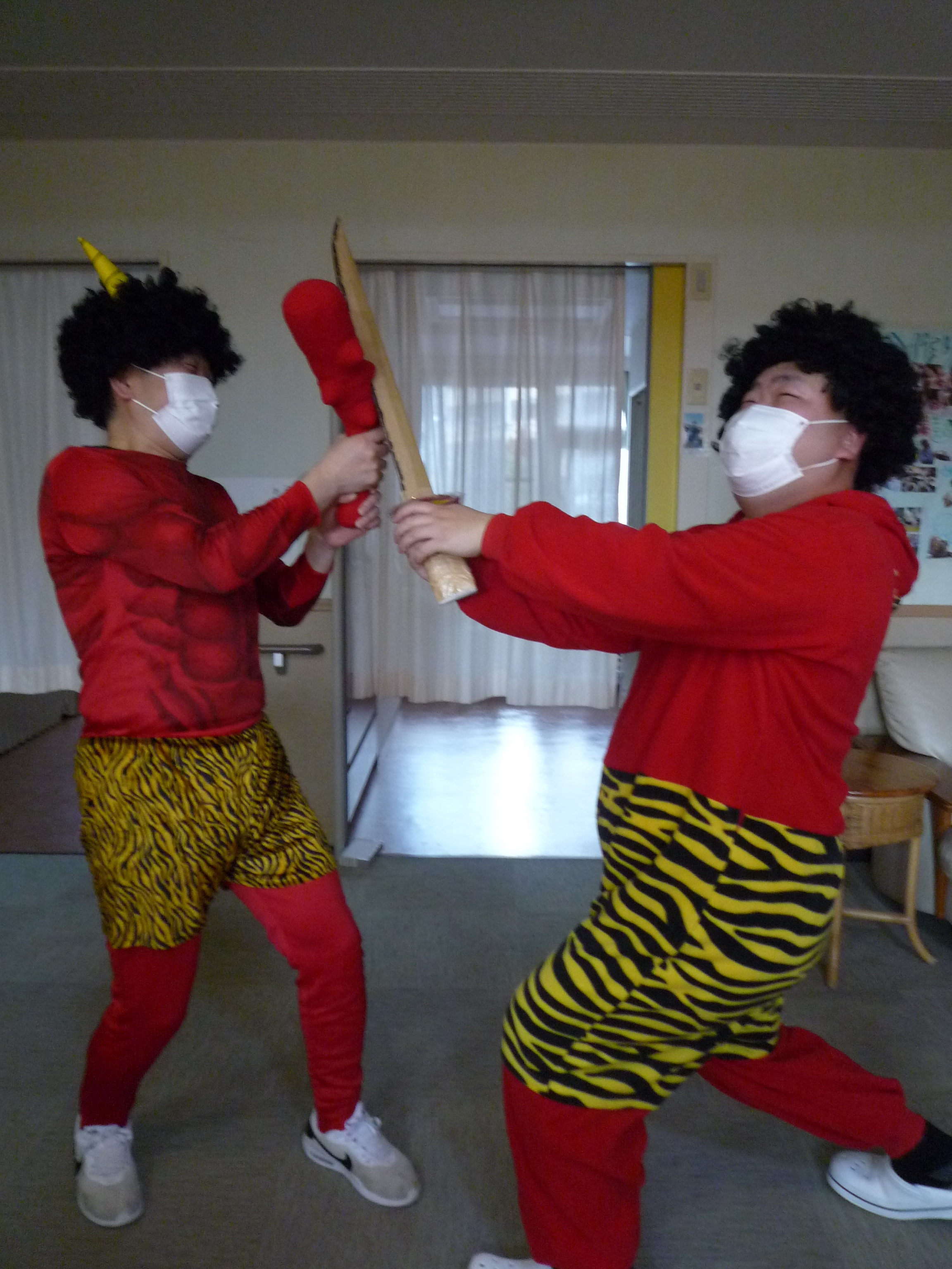 鬼とジェイソンが登場し、ゲストさんが紙の豆を投げて