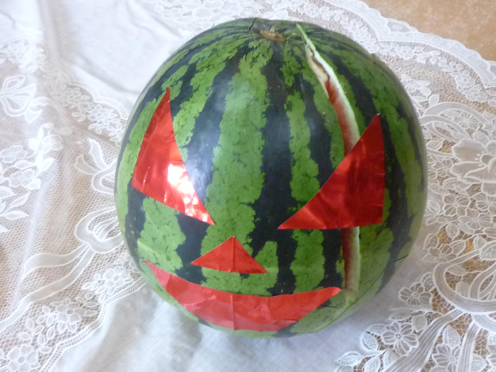 見事に割れ?、皆さまとご一緒にスイカを器にして、?フルーツポンチを作って