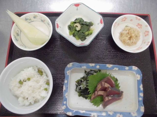 豆ごはん・菜の花とえびの炒め物・おろし和え・フルーツ