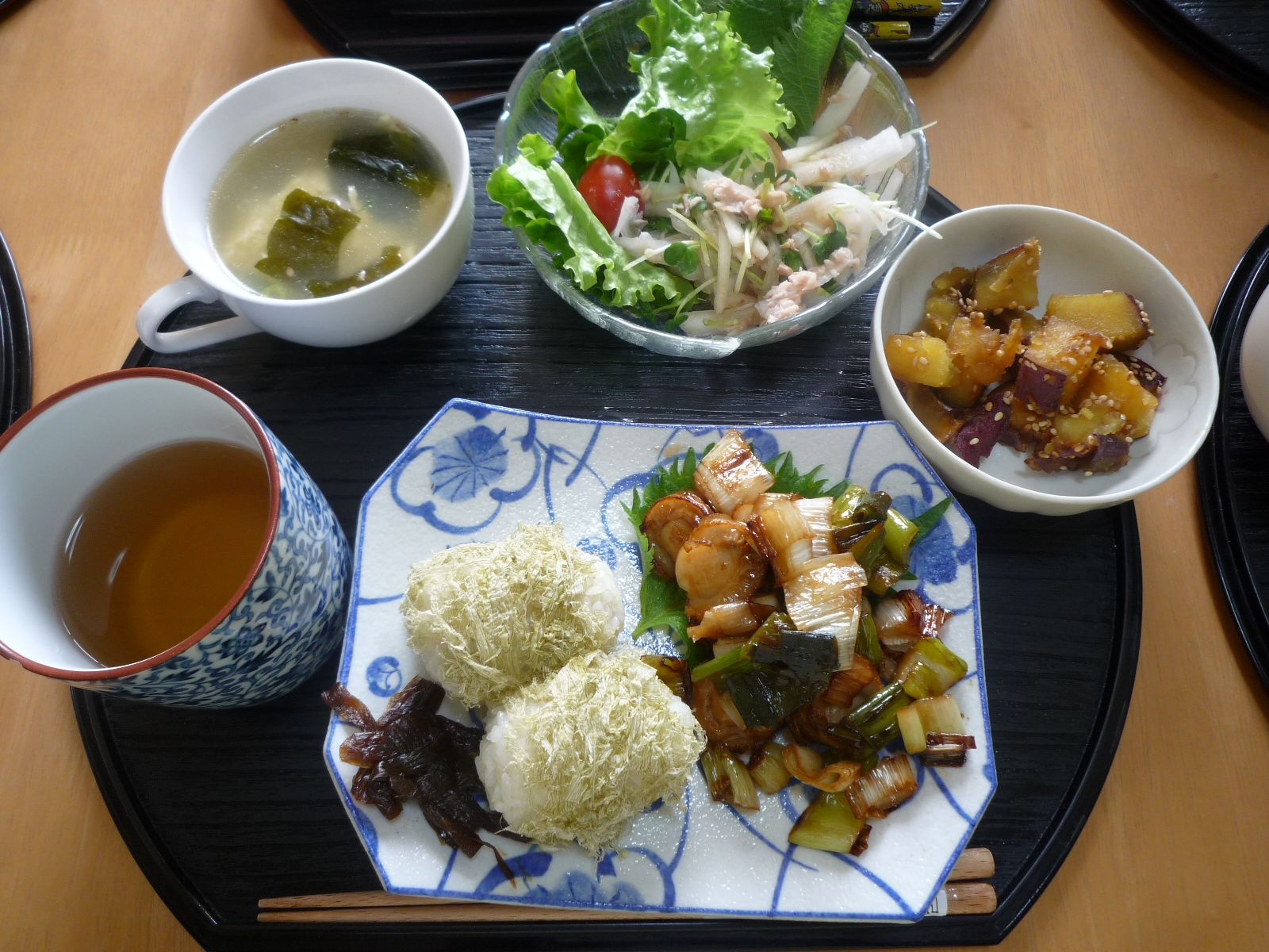 ③ホタテの照り焼き?・中華スープ?・大根サラダ?・サツマイモの甘露煮?