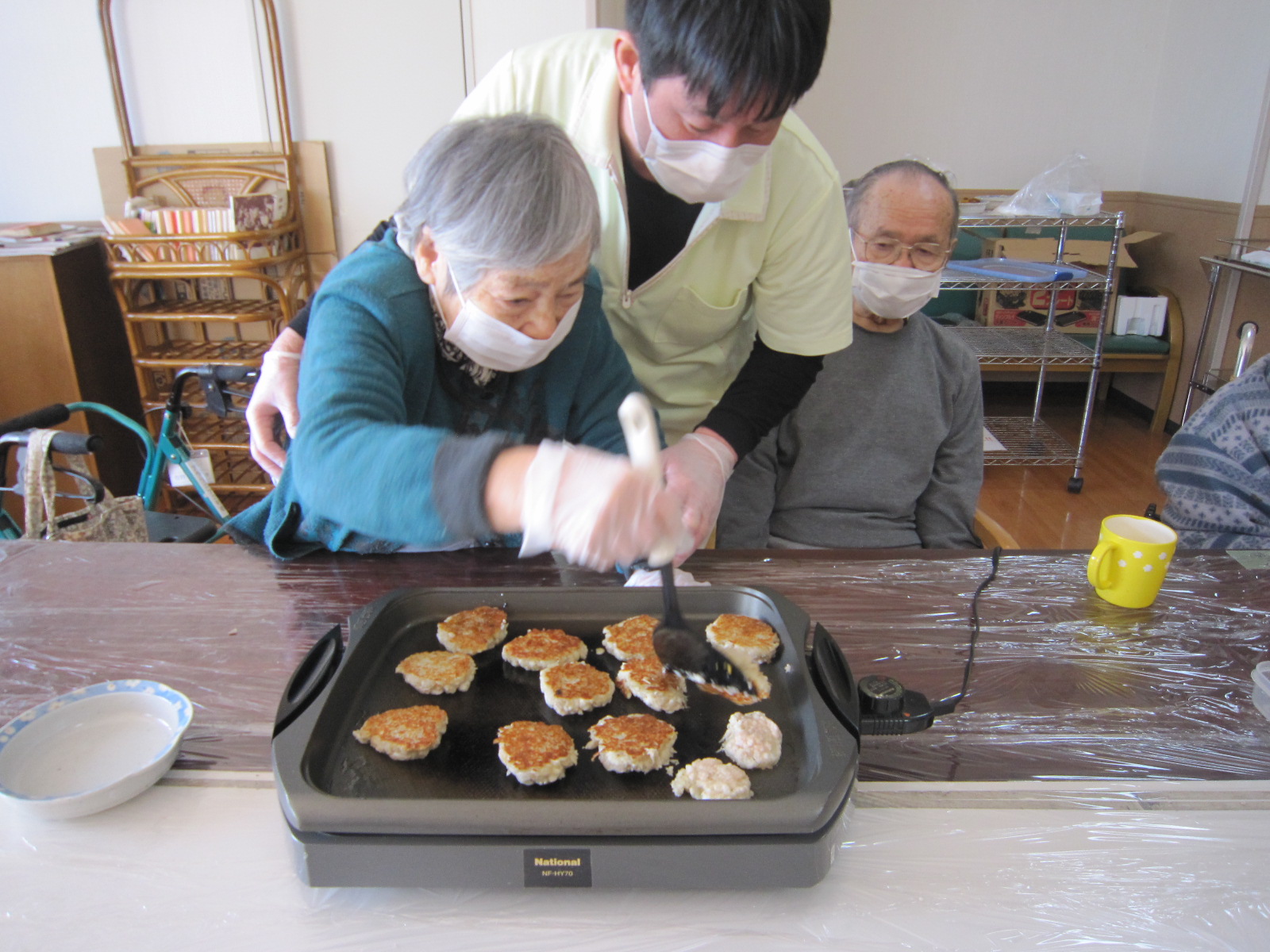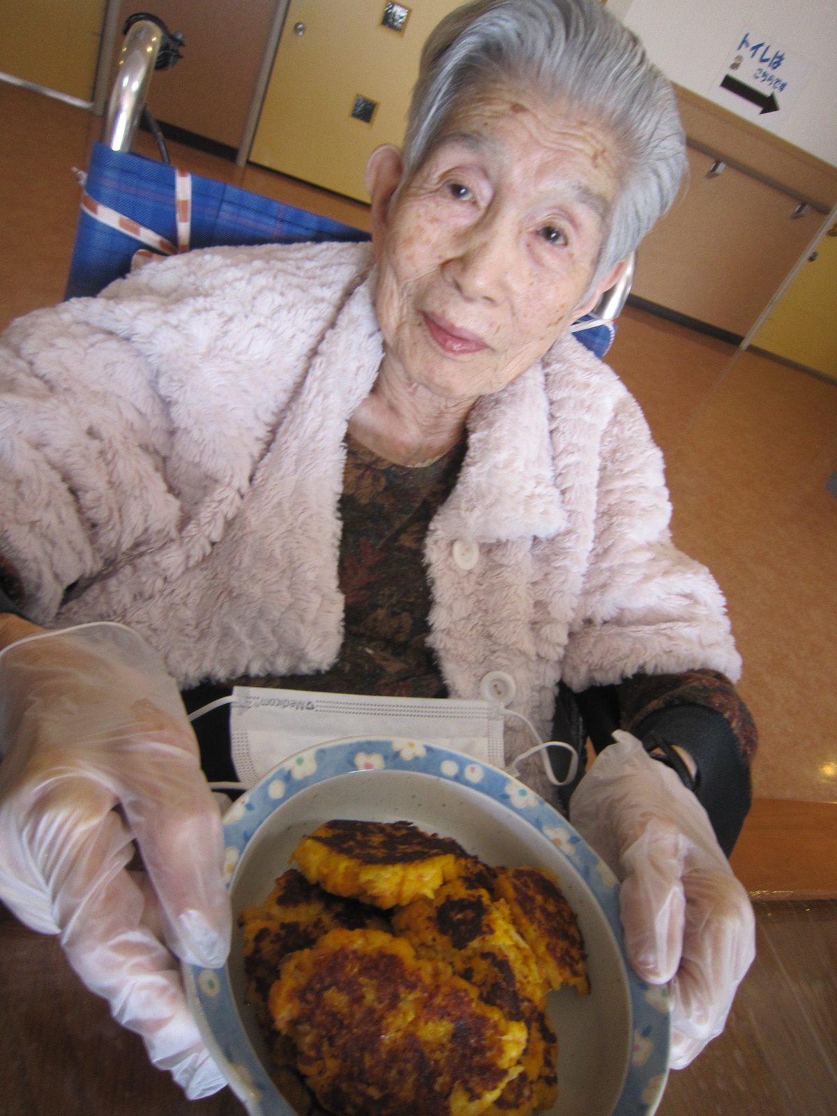 老健フロアでは、お焼きの具材にはんぺん・じゃがいも・にんじんを用い、