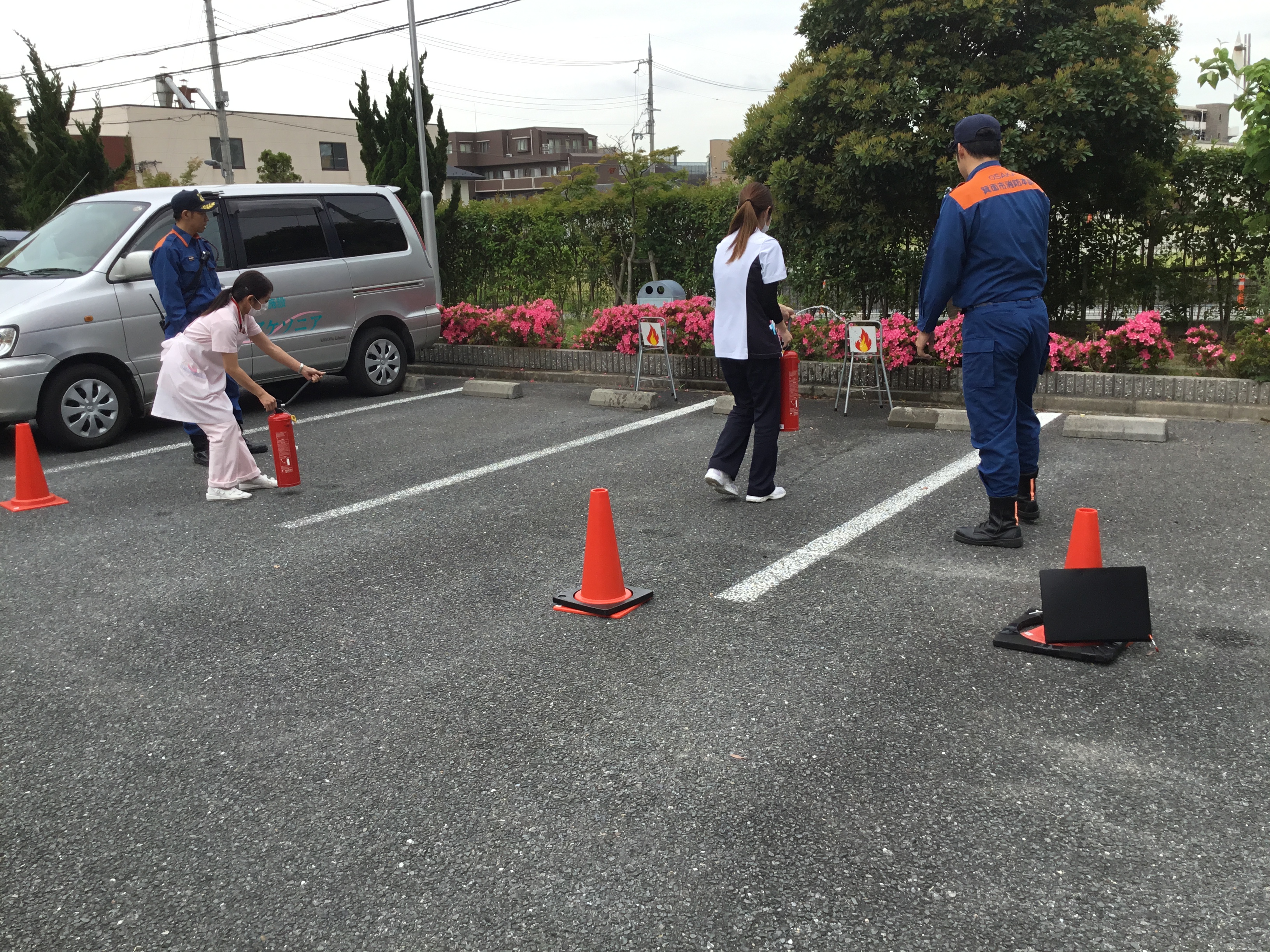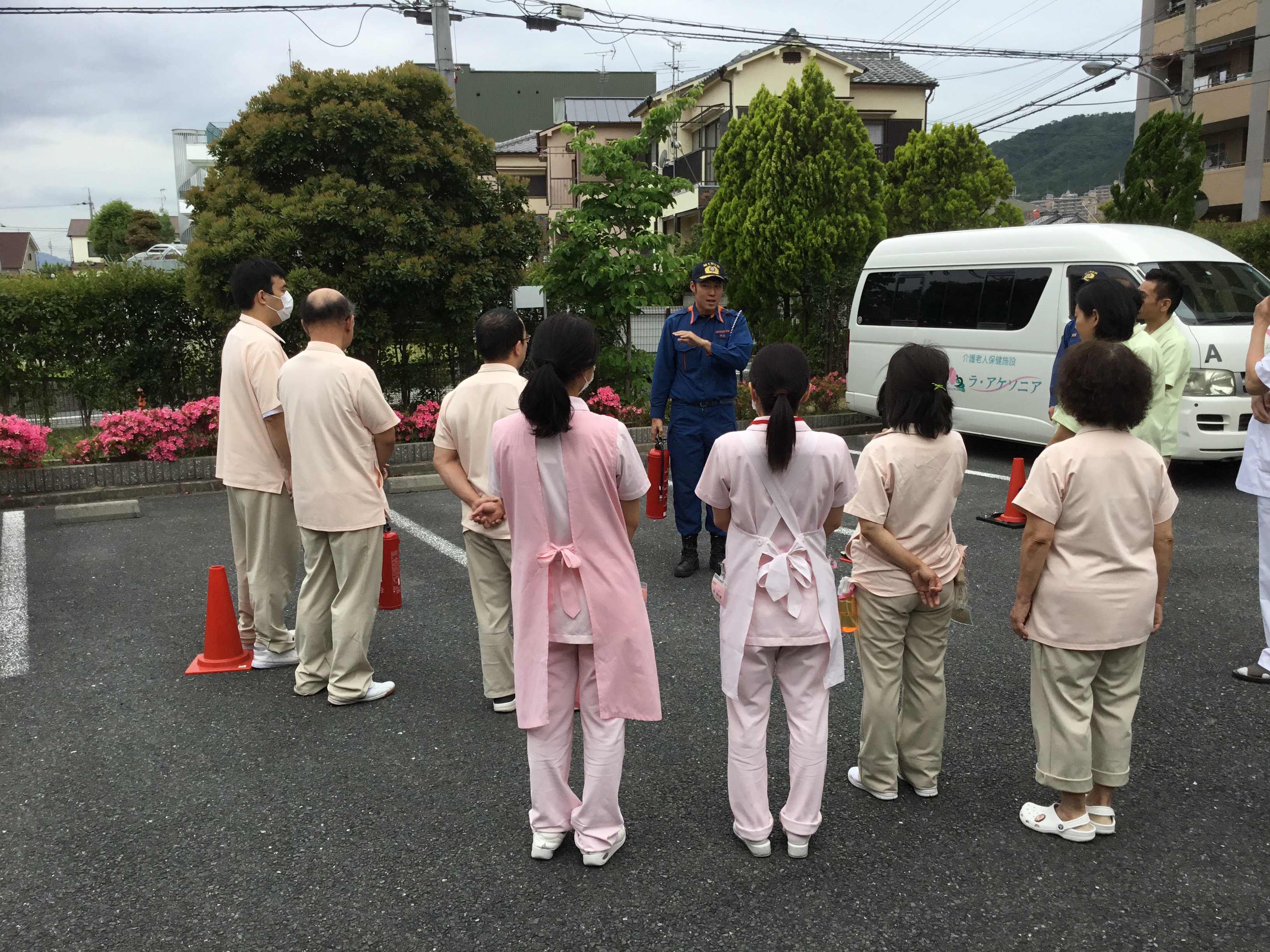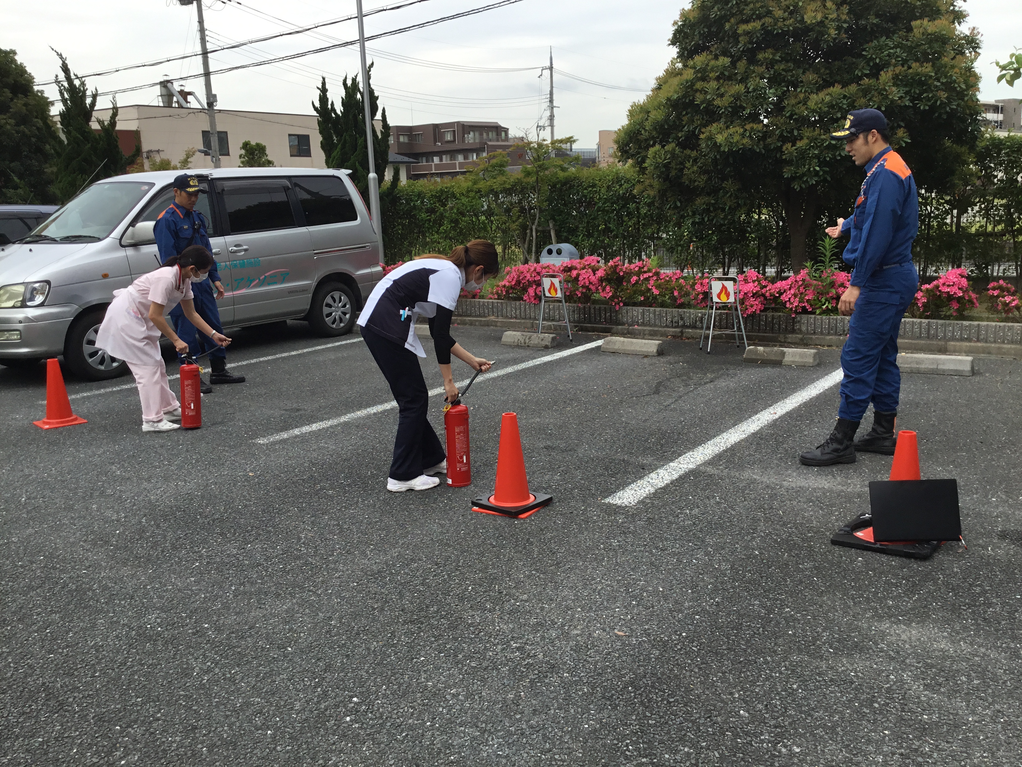 消防士さんに、アケソニア職員がゲスト様と共に、火災が起きたと想定した、