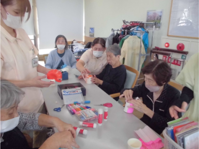 やっと秋らしく肌寒い日が続いてきましたね。 デイケアでは10月レクリエーションでゲストの皆様で大きな円になり音楽に合わせて人形送りのゲームをしました。 皆様とても素敵な笑顔で楽しまれていました!! 創作レクではハロウィンも近づいてきたので、その時期らしいかわいい飾りも作りました。 大阪万博閉幕の日は、皆様で名残惜しみながら万博の生中継をテレビ鑑賞しました。