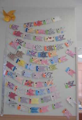 折り紙でたくさんのこいのぼりを作ってもらい、壁一面に泳いでる雰囲気を出してみました♪