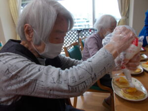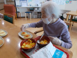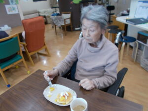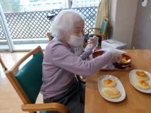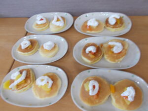 ゲスト様に焼いたパンケーキのデコレーションを手伝って頂きました