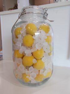 その後、梅を洗い直し、十分水気をとったら、保存容器に氷砂糖を敷き詰め、