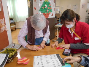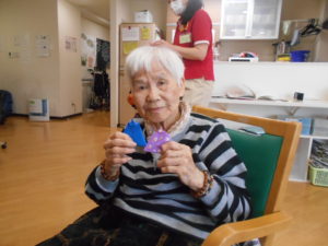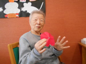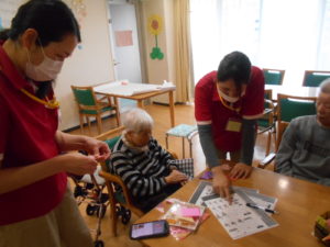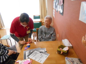 ひな祭りの折り紙をゲスト様に折ってもらいました。