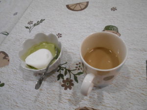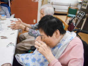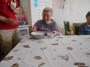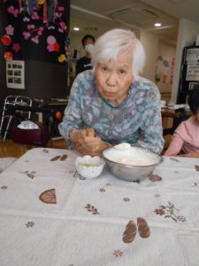 この日は、おやつレクリエーションで『抹茶プリン』をゲスト様に手伝って