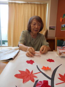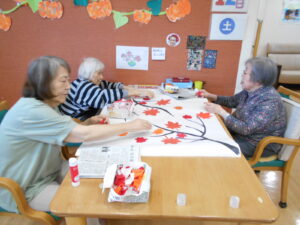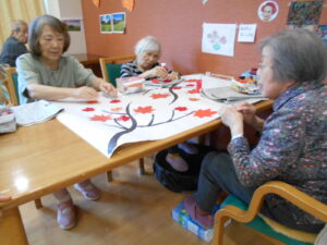 ゲスト様に秋の壁紙に飾るもみじの葉っぱを制作して頂きました