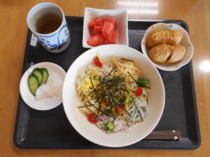 三色そうめん、いなり寿司、デザートのスイカで題して『たなばた定食』