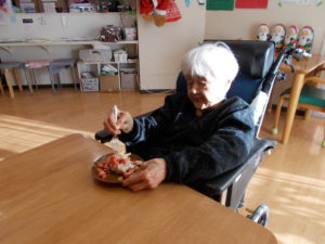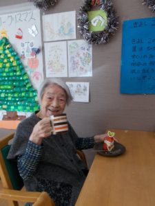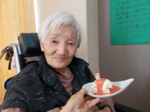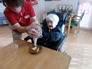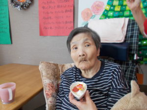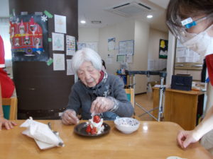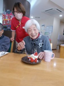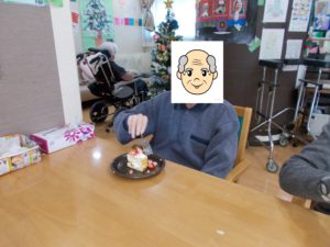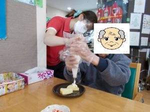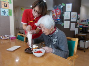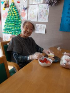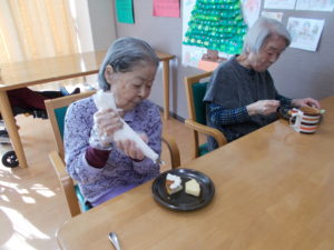 今日は、おやつのレクリエーションで、クリスマスケーキを