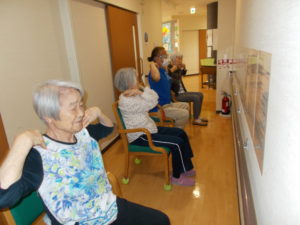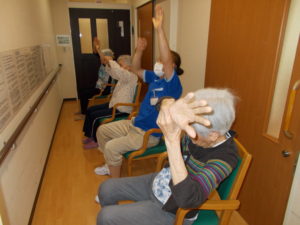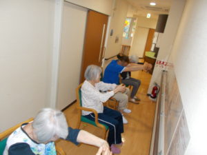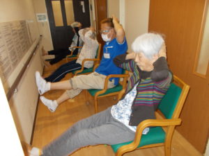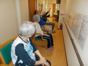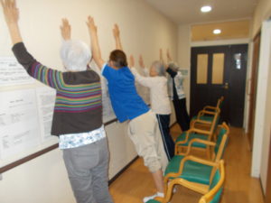 体操レクリエーションで、壁を利用した体操をゲスト様と一緒に行いました?