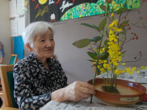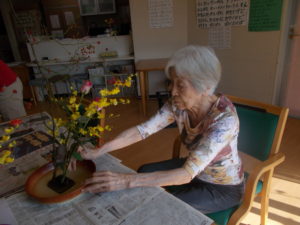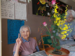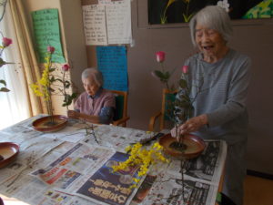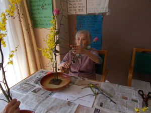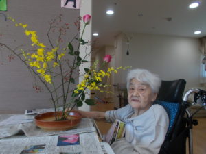 この日は、生花レクリエーションでした。コロナ禍でボランティアの先生が
