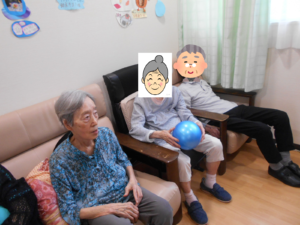 昼食後のひと時、ゲスト様フロアにて過ごされていたおり、ゴムボールでキャッチボールレクリエーションを行いました。