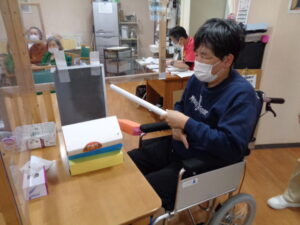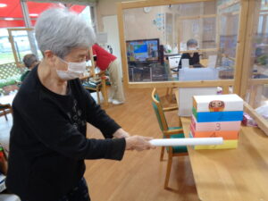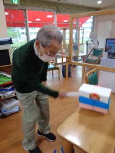 “だるま落とし”ゲームです。ティッシュの箱を活用して”だるま”を制作。それを積み重ねて”だるま落とし“ゲームの開始です。上手く落とした”だるま”で点数を競います。結構力が入りますよ!