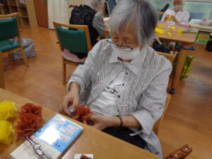 花紙を束ね1枚ずつ綺麗に広げて貼り付けていきます。何が出来るか楽しみです。
