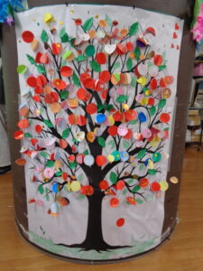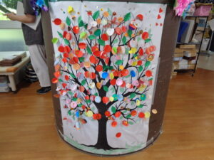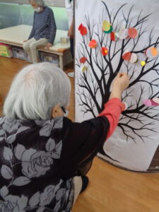 色紙でさくらんぼを作り木に貼付けていきます。細かな作業ですがとてもカラフルです。可愛いですね。