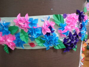 どうでしょう!!立体感のあるさくらんぼ壁面の完成です。とても素晴らしいです。横には紫陽花の花も飾り付けています。