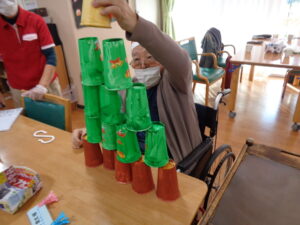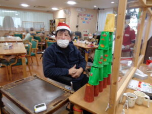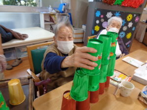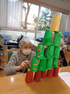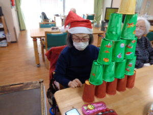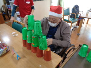 クリスマスです。フロアではクリスマスツリー紙コップ積上げゲームを開催しました。15個のクリスマスツリーに色取った紙コップを何秒で積み上げる事が出来るかのゲームです。意外とバランスをとるのが難しいです。