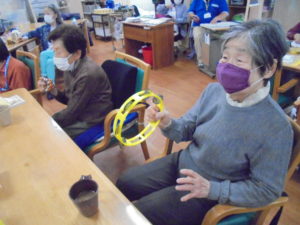 あおまだにでは初めての試みと致しまして、音楽のリズム遊びのレクリエーションを行いました。先ずは、タンバリン・鈴のどちらかを選んで頂き、持ち方と鳴らし方を説明致しました。皆様と一緒にリズム打ちをして楽しみました???