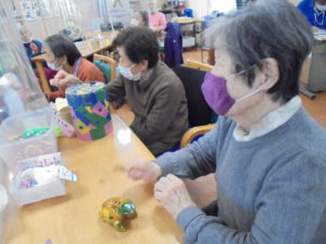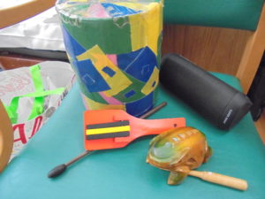 茶色のこびん・南の島カメハメハ大王・ふしぎなポッケット・365歩のマーチの曲に合わせてリズムよく鳴らして頂きました??? カエルの形をしたギロ・カタカタと音がする鳴子・手作り太鼓にも挑戦して頂きました。楽しく上手に打楽器を鳴らす事が出来て嬉しく思いました。