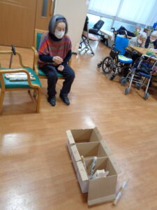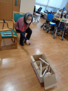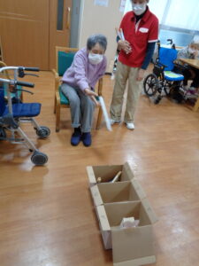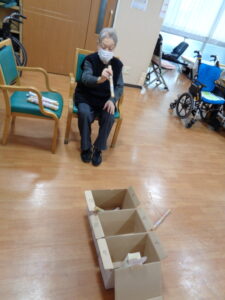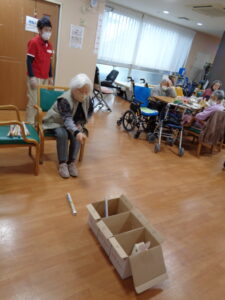 『2月は逃げる』と言いますがあっという間に2月も終わりですね。あおまだにフロアでは毎回違ったレクリエーションを実施し、ゲスト様に喜んでいただけるように工夫しております。本日は『やり投げ』ゲームです。新聞紙を丸めて作ったやり(棒)を3か所に並んだ箱に入れます。10点・20点・30点・100点とあります。