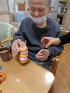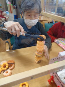 ツムツムって? 見ての通りです。ドーナッツをトングで慎重に積んでいきます。とても集中力が必要でバランスをとるのが難しいです。