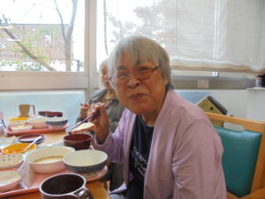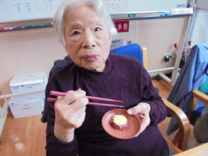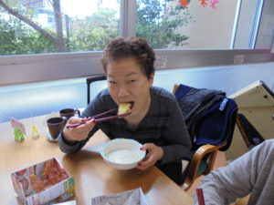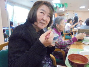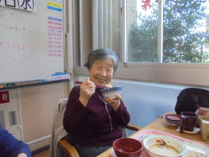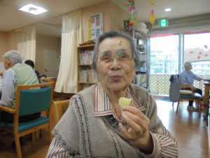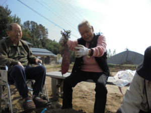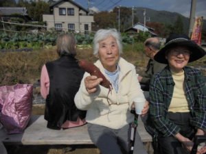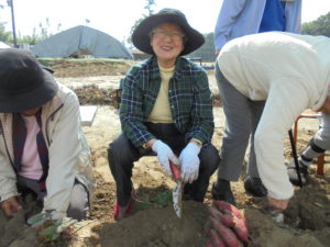 みなさんとてもいい笑顔です☺芋ほりをした後はお茶を1杯いただき、施設に戻り・・・