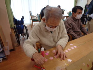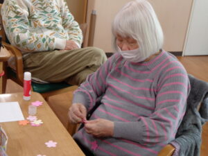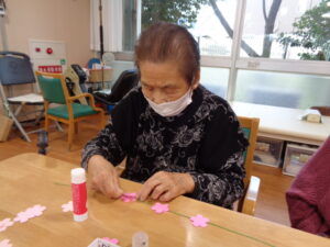 桜の花に型どられた色画用紙を綺麗に紐に貼付けていきます。細かな作業ですが完成すると中々の出来栄えです