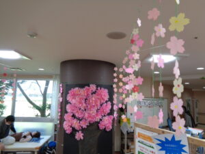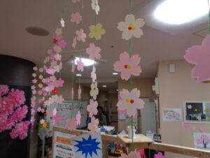 フロアは桜🌸の壁面と桜🌸の吊るし飾りでいっぱいです。とても素晴らしい景色です。🌸🌸🌸🌸🌸
