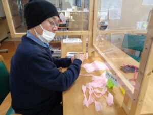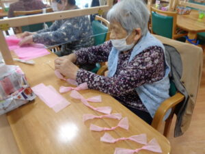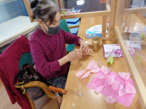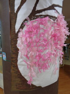 ピンクの薄い紙を花びらにの様に作ります。それを紐でつなげていきます。どうでしょう見事な吊るし桜です。