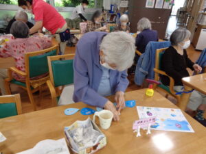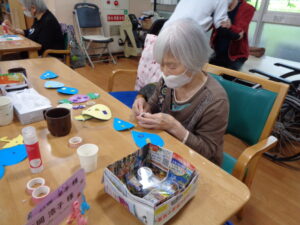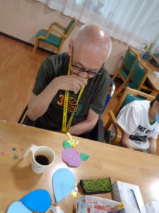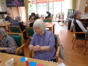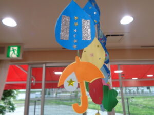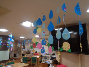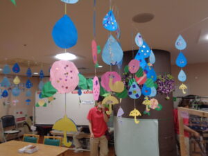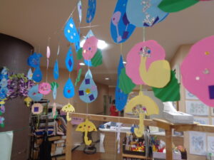 6月に入り関西の梅雨入りはまだ明確には発表されていませんが、あおまだにフロアでは雨の吊るし飾り制作をしフロアに吊るしています。とても鮮やかで綺麗です。ジメジメとした雰囲気はないです。