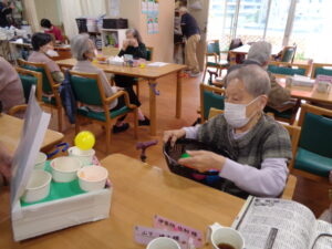魚釣りゲーム・ボール入れゲーム・茶摘みゲームや内容は様々です。皆さん真剣に笑顔で楽しんでいただいています。