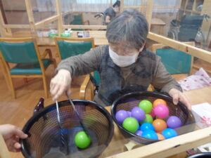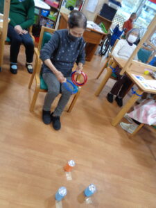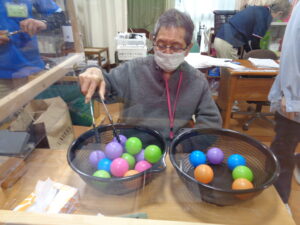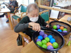 ②ボール移しゲームです。1分間で何個カラーボールを移す事が出来るか競争です。日常動作訓練にも繋がります。