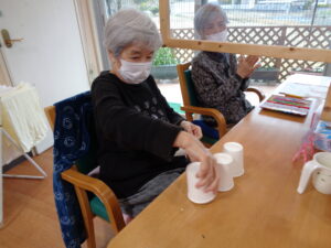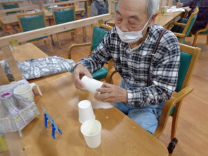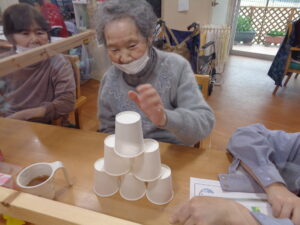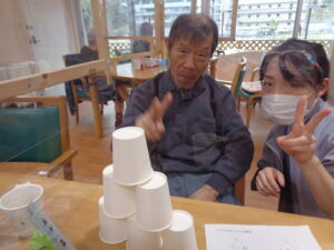 ①紙コップピラミッド積み上げゲームです。何秒で積めるか競争です。神経集中です。