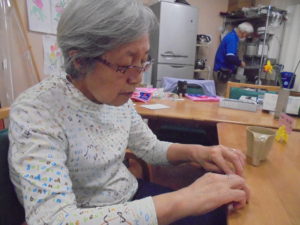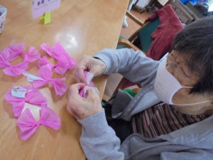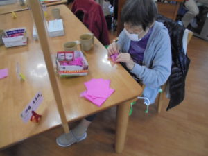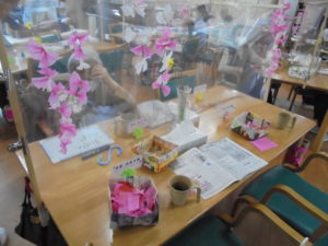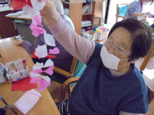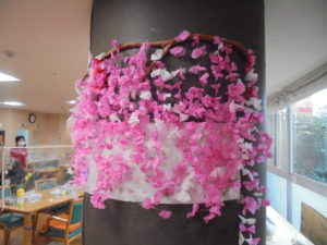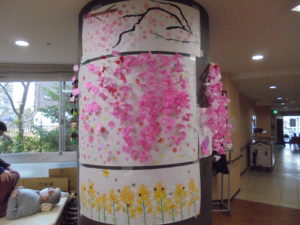 デイサービスではゲスト様と職員でフロアーを桜景色に飾り付けています。?